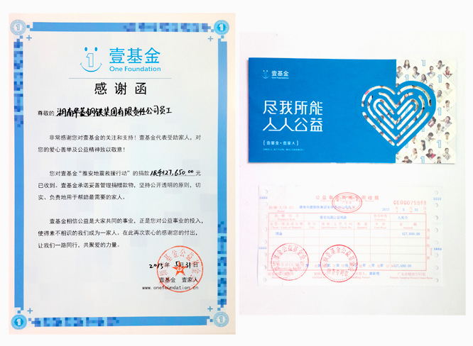 今年4月20日的雅安地震,牽動(dòng)著華菱員工的心。華菱員工在第一時(shí)間付出了許多愛(ài)心行動(dòng),有提出捐款捐物的,有愿意參與救災(zāi)志愿團(tuán)隊(duì)的,有在微博、微信、論壇為災(zāi)區(qū)同胞祈福的,等等。對(duì)此,華菱集團(tuán)工會(huì)迅速在總部及在長(zhǎng)公司員工中組織開(kāi)展“華菱員工心系雅安”募捐活動(dòng),在規(guī)定的時(shí)間內(nèi)共收到捐款127650元。5月2日,集團(tuán)工會(huì)將愛(ài)心行動(dòng)募集到127650元善款,全部轉(zhuǎn)賬至深圳壹基金公益基金會(huì),委托其用于雅安地震救災(zāi),將華菱集團(tuán)總部及在長(zhǎng)子公司308名員工的關(guān)愛(ài)之情傳遞到災(zāi)區(qū)。