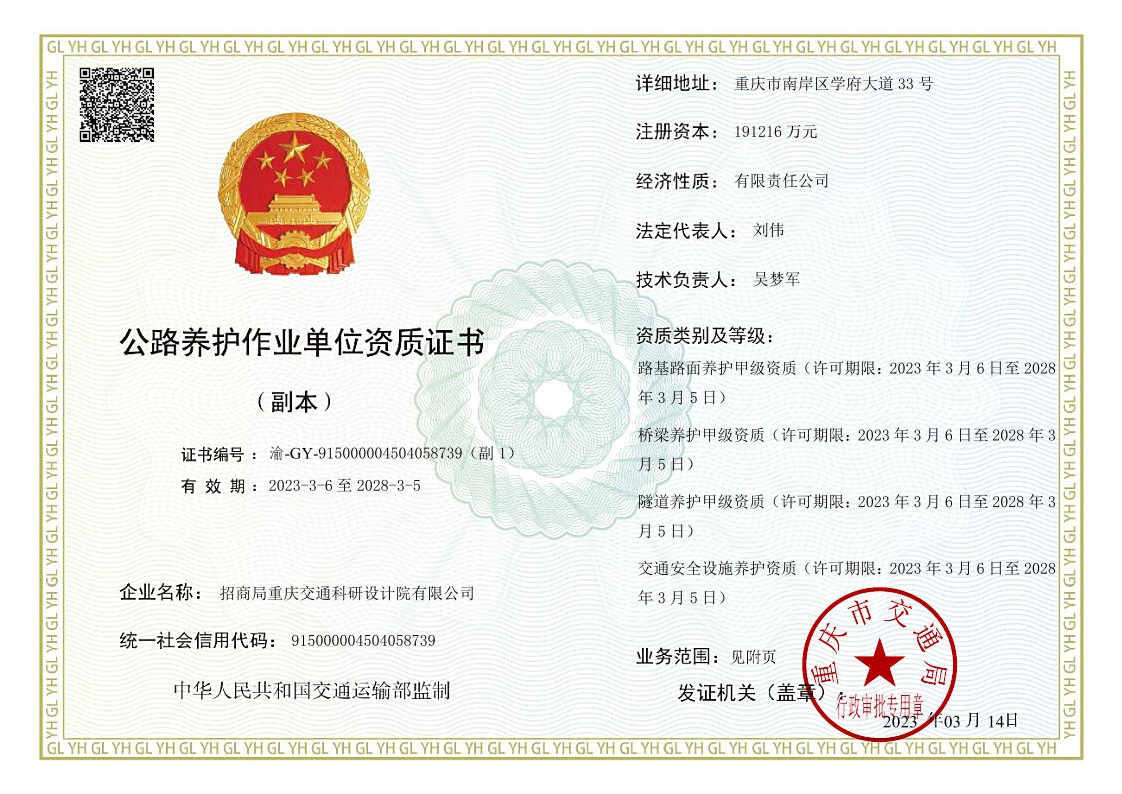3月15日,重慶市交通局向招商交科頒發(fā)了公路養(yǎng)護(hù)作業(yè)單位資質(zhì),包括:路基路面養(yǎng)護(hù)甲級(jí)、橋梁養(yǎng)護(hù)甲級(jí)、隧道養(yǎng)護(hù)甲級(jí)、交通安全設(shè)施養(yǎng)護(hù)資質(zhì)(不分級(jí)),涵蓋交通運(yùn)輸部公路養(yǎng)護(hù)作業(yè)全序列最高資質(zhì),填補(bǔ)了招商交