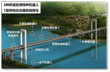研制水、陸、空立體協(xié)同的大跨度橋梁檢測(cè)與評(píng)估裝備體系,形成全地域全橋型的檢測(cè)能力,實(shí)現(xiàn)橋梁表面、纜索、水下結(jié)構(gòu)等關(guān)鍵部位的高效初檢、全面詳檢、數(shù)據(jù)分析、損傷評(píng)估等一體化服務(wù),極大提高大跨度橋梁定檢、特