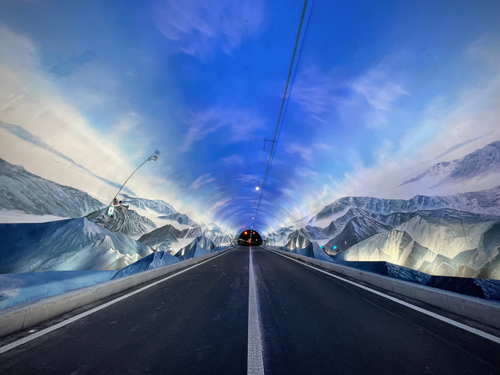 本次通車段共包含5個(gè)隧道,隧道洞門及洞內(nèi)景觀由景觀與建筑設(shè)計(jì)院設(shè)計(jì)并實(shí)施。城開(kāi)特長(zhǎng)隧道長(zhǎng)達(dá)11.5公里,是重慶市目前最長(zhǎng)的高速公路隧道,其中景觀拓寬段通過(guò)“聲”、“光”、“畫(huà)”的方式,打造出國(guó)內(nèi)首座純手繪“4D景觀”高速公路隧道。