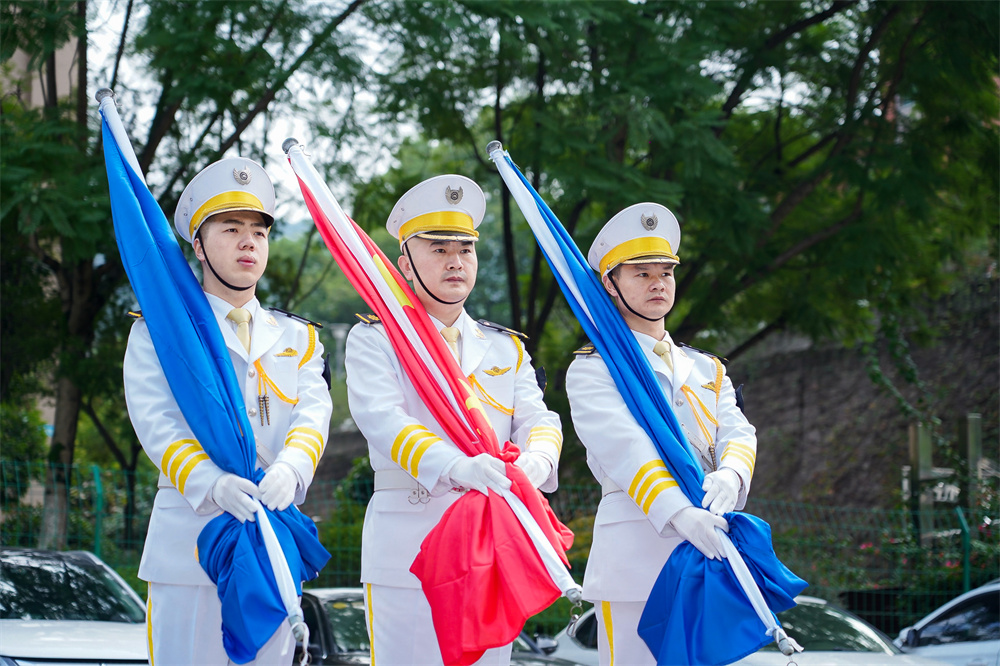 升旗儀式上,身著白色制服的儀仗隊員護著國旗、招商局旗,邁著整齊的步伐走向升旗臺。在《國歌》和《招商局之歌》的莊嚴歌聲中,五星紅旗和招商局旗先后冉冉升起,迎風飛揚。