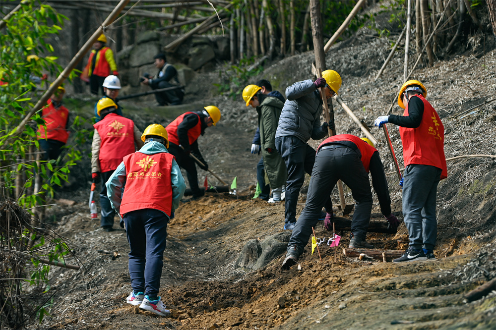 志愿者們結合自身科技環(huán)保工作專業(yè)優(yōu)勢,分工協(xié)作、齊心協(xié)力,雙手緊握鋤頭、撬棍,生澀地鋤開每一塊焦土,艱難地撬開每一塊攔路之石。大家拿著沉重的斧子柴刀、鑿子鋼鋸,一刀一刀清理殘枝碎土,一錘錘鑿出青石板踏步石,一寸寸細土填縫抹平。男同志大汗淋漓,重活、累活搶著干,女同志巾幗不讓須眉,鋸木頭、做楔子,樣樣行。歷經(jīng)三個多小時的勞作,長約30米的步道修繕完成,遠超計劃目標長度。