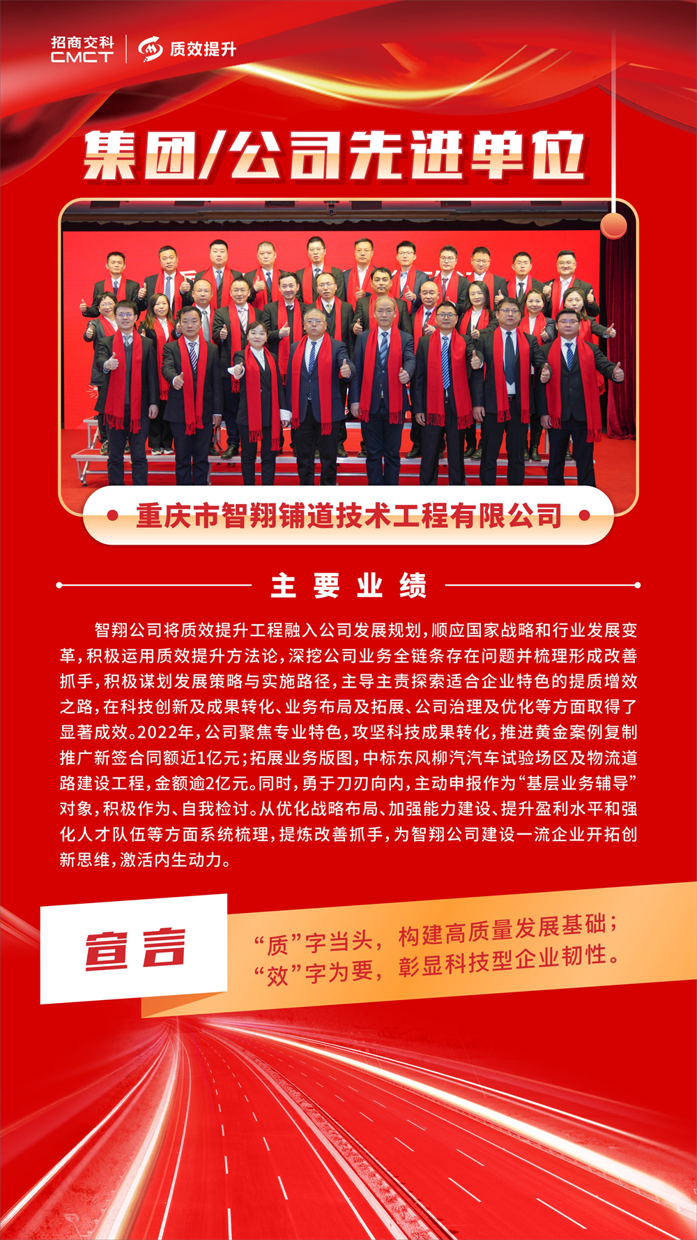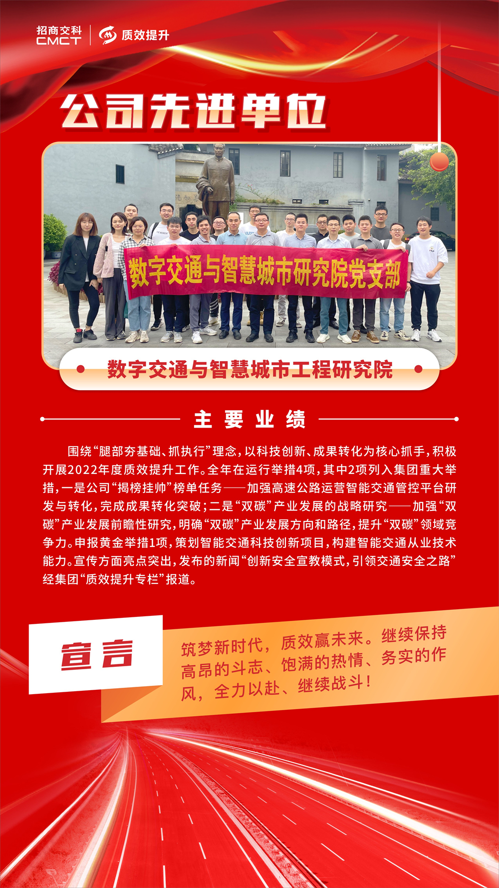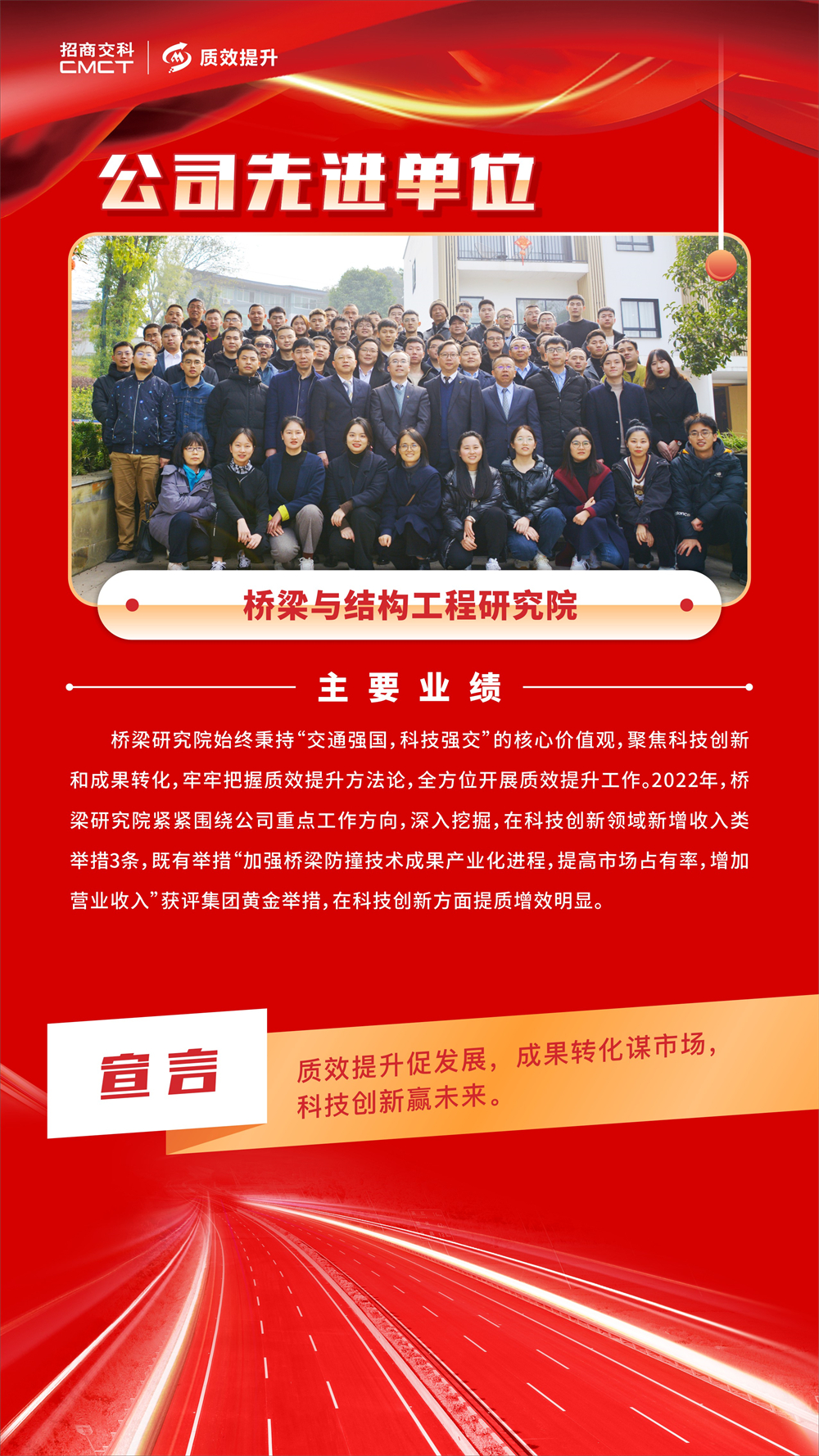 ? 各部門和單位要以先進單位、先進個人為榜樣,堅定不移推動質(zhì)效提升工作走深走實,助力招商交科高質(zhì)量發(fā)展。