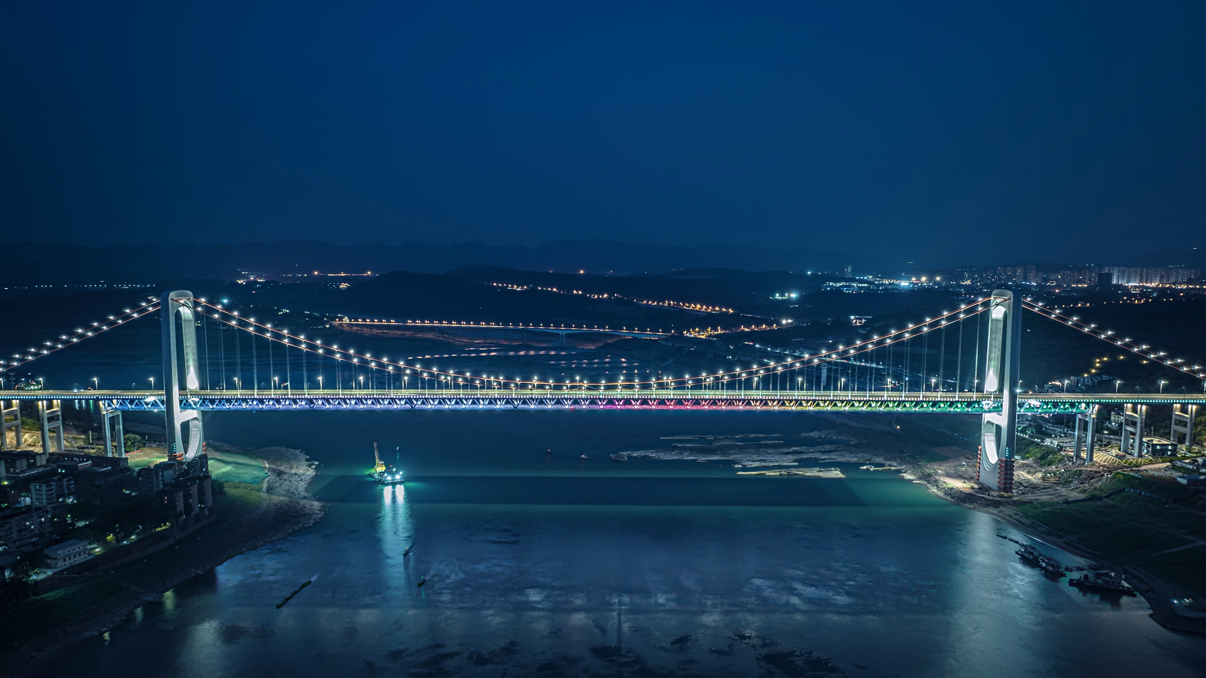 大橋采用“門楹納水”的設(shè)計(jì)理念,橋塔造型將“門”的基本形式和“水”的流暢形態(tài)完美融合,塔身圓潤的輪廓、主纜柔美的線型與山城重慶的獨(dú)特韻味相得益彰。橋塔與主纜剛?cè)岵?jì),體現(xiàn)人與自然和諧共生的美學(xué)追求。橋梁色彩搭配以突出懸索橋形態(tài)為主題,皓月白橋塔搭配國際橙色纜索,賦予橋梁跳躍靈動(dòng)的生命力。夜景打造考慮橋體結(jié)構(gòu)兼顧與城市環(huán)境的關(guān)系,運(yùn)用光影層次、色彩變化營造“致用、目觀、暢神”的城市橋梁景觀,為重慶山水之城勾勒出別樣的奇妙色彩。