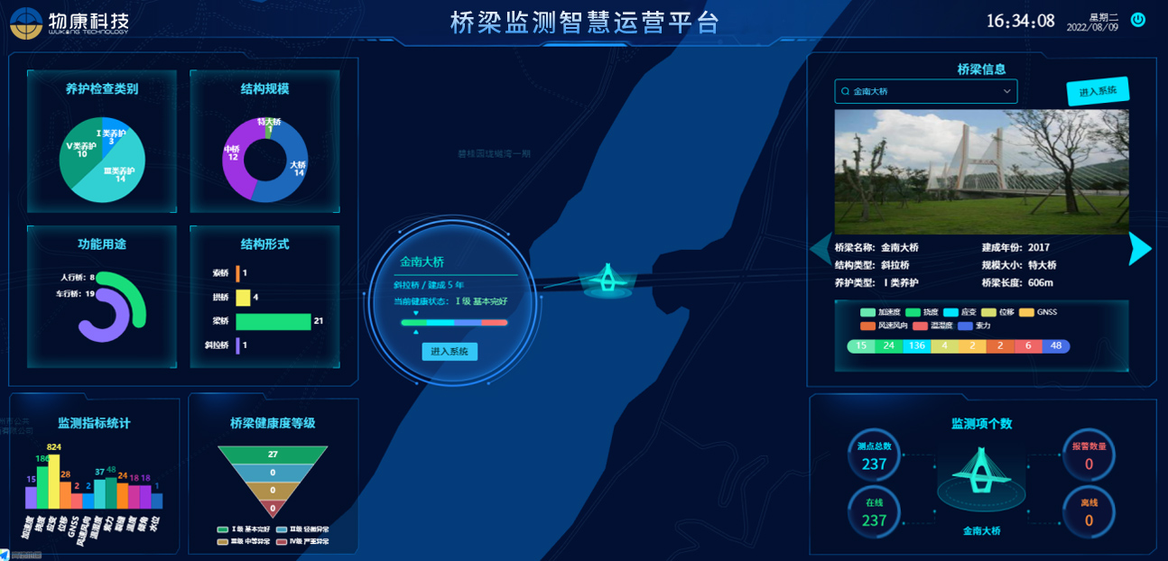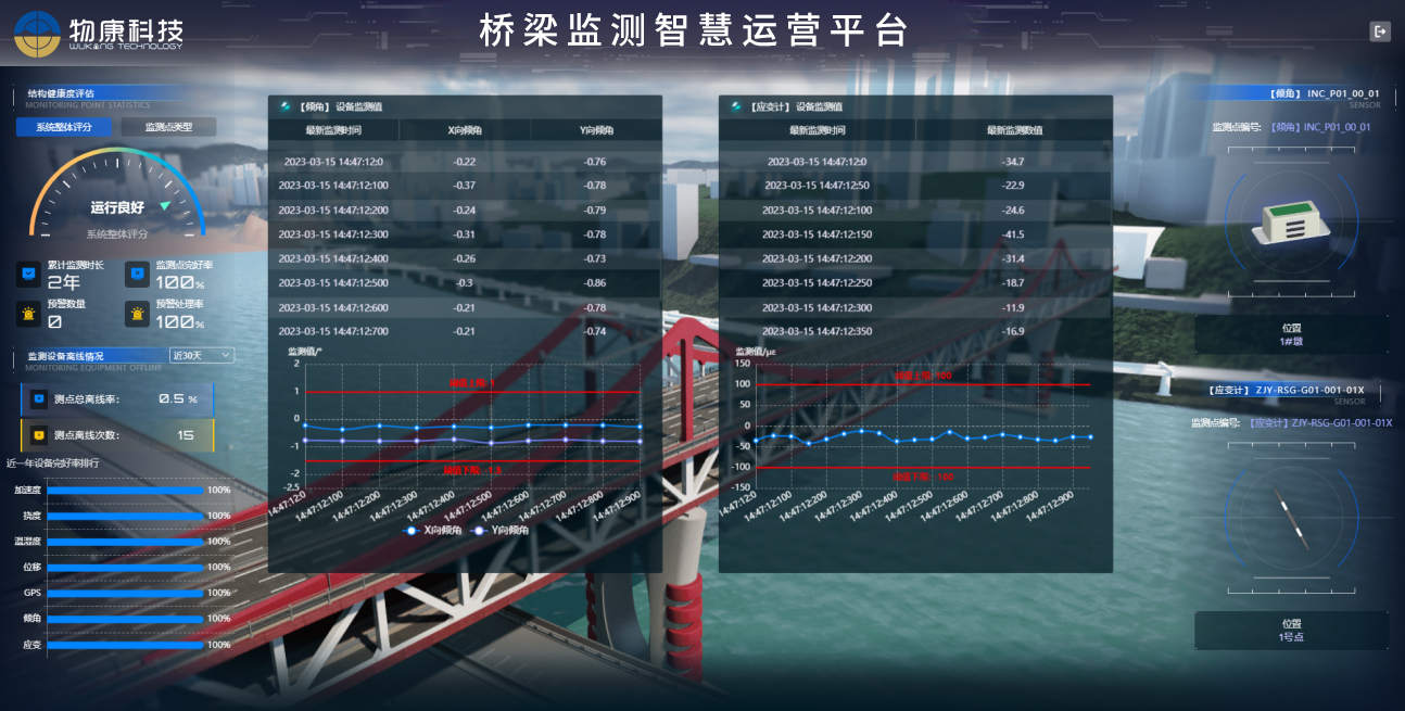 物康科技以“橋梁云?”結(jié)構(gòu)安全智能監(jiān)測平臺為起點,在前期發(fā)展時聚焦橋梁健康監(jiān)測領(lǐng)域,獲得了鄂東長江大橋、齊河黃河大橋、重慶高家花園軌道專用橋、重慶曾家?guī)r嘉陵江大橋、達州市政橋梁群、清遠公路橋梁群等監(jiān)測項目,先站穩(wěn)腳跟,而后持續(xù)發(fā)力,以重大項目為抓手、以重點領(lǐng)域為突破,承擔兩大?。ㄊ校┘壉O(jiān)測平臺建設(shè)、重慶郭家沱長江大橋及南延伸段智慧運營平臺項目、港珠澳大橋主動防船撞預警系統(tǒng)設(shè)計、海南某大橋渦振應(yīng)急監(jiān)測、香港將軍澳跨灣大橋健康監(jiān)測咨詢等項目,護航國家重大工程安全,贏得良好市場信譽。