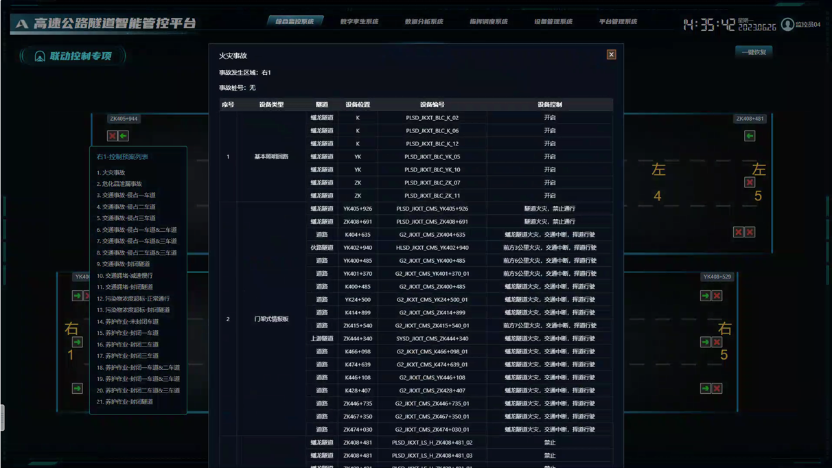 團(tuán)隊(duì)研發(fā)了公路隧道群-路段-互通協(xié)同控制技術(shù),建立了公路隧道機(jī)電設(shè)施動(dòng)態(tài)協(xié)同管控方法,形成相應(yīng)的管控預(yù)案庫,按照“一隧一方案”制定了基于事件類型及隧道分區(qū)的應(yīng)急控制策略,并成功應(yīng)用到陜西秦嶺終南山隧道、江蘇太湖隧道等重點(diǎn)工程,實(shí)現(xiàn)了突發(fā)事件快速響應(yīng)、一鍵聯(lián)動(dòng),提高運(yùn)營管理單位的突發(fā)事件處置和協(xié)同管理能力。研究成果已納入交通運(yùn)輸行業(yè)標(biāo)準(zhǔn)《高速公路隧道運(yùn)營突發(fā)事件應(yīng)急預(yù)案編制要求》(送審稿)。