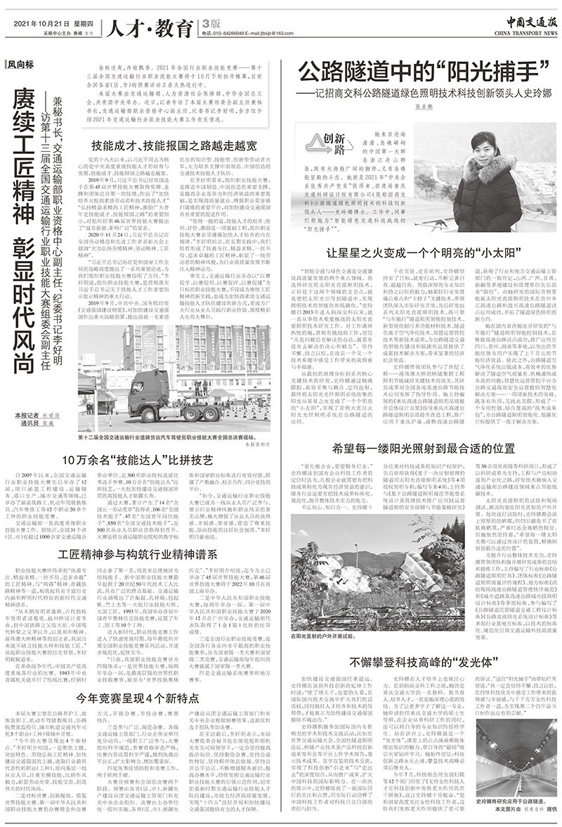 【編者按】史玲娜,現(xiàn)任招商交科交通與節(jié)能工程院副院長,自2013年進(jìn)入公司以來,就長期致力于太陽光光纖照明技術(shù)方面的研究工作,她以卓越的成績詮釋了一線科技工作者的責(zé)任與擔(dān)當(dāng),獲評為2021年“中央企業(yè)優(yōu)秀共產(chǎn)黨員”。2021年10月21日,《中國交通報》以《公路隧道中的“陽光捕手”——記招商交科公路隧道綠色照明技術(shù)的科技創(chuàng)新領(lǐng)頭人史玲娜》為題,刊發(fā)專題報道,講述了史玲娜長期扎根于公路交通科技創(chuàng)新一線的奮斗故事?,F(xiàn)將報道原文轉(zhuǎn)載如下: