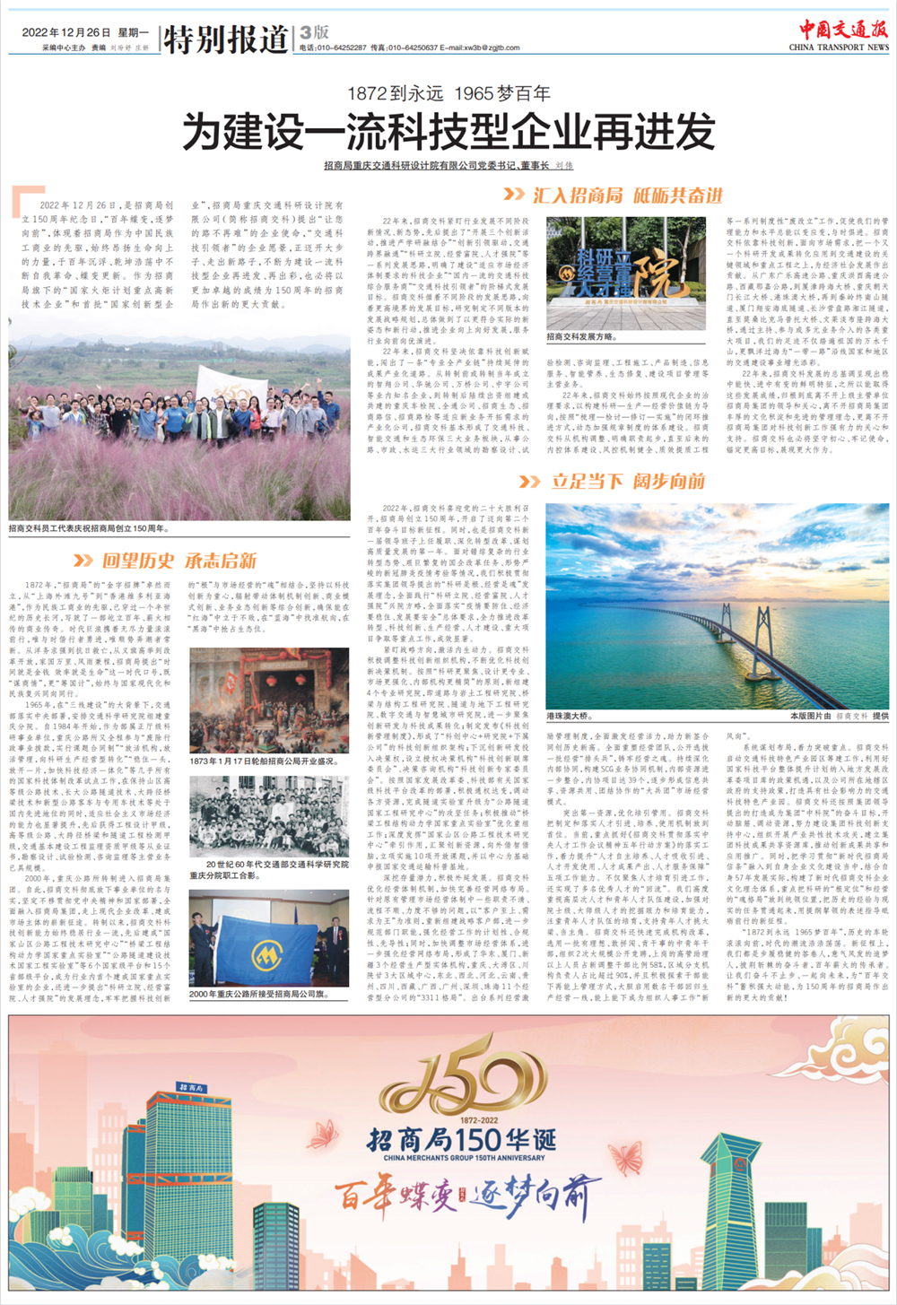 2022年12月26日,是招商局創(chuàng)立150周年紀念日,《中國交通報》在第三版整版刊發(fā)了招商交科黨委書記、董事長劉偉署名文章,表達了招商交科全體干部員工對招商局集團的祝福和感激。自2000年轉制進入招商局集團22年來,在招商局集團的正確領導下,招商交科建設科技型企業(yè)信心更堅定,道路更寬闊,成果更豐碩。面向未來,招商交科深入學習貫徹黨的二十大精神,按照招商局集團的戰(zhàn)略規(guī)劃,向著一流勇毅前行!現(xiàn)將全文轉載如下: