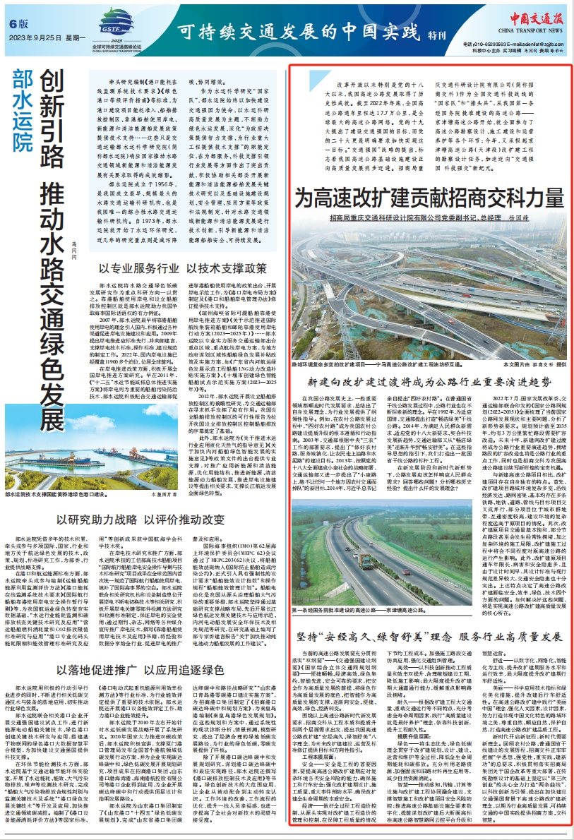 9 月 25 日,《中國(guó)交通報(bào)》在第六版《可持續(xù)交通發(fā)展的中國(guó)實(shí)踐》特刊,全文刊發(fā)了招商交科黨委副書(shū)記、總經(jīng)理?xiàng)顕?guó)峰的署名文章《為高速改擴(kuò)建貢獻(xiàn)招商交科力量》。