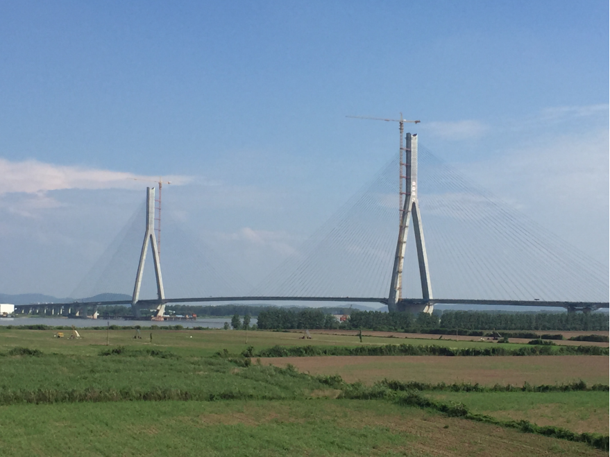 武漢沌口長江公路大橋處于白沙洲長江大橋和軍山長江大橋之間。大橋全長5296m,主跨760m,雙塔雙索面鋼箱梁斜拉橋。
