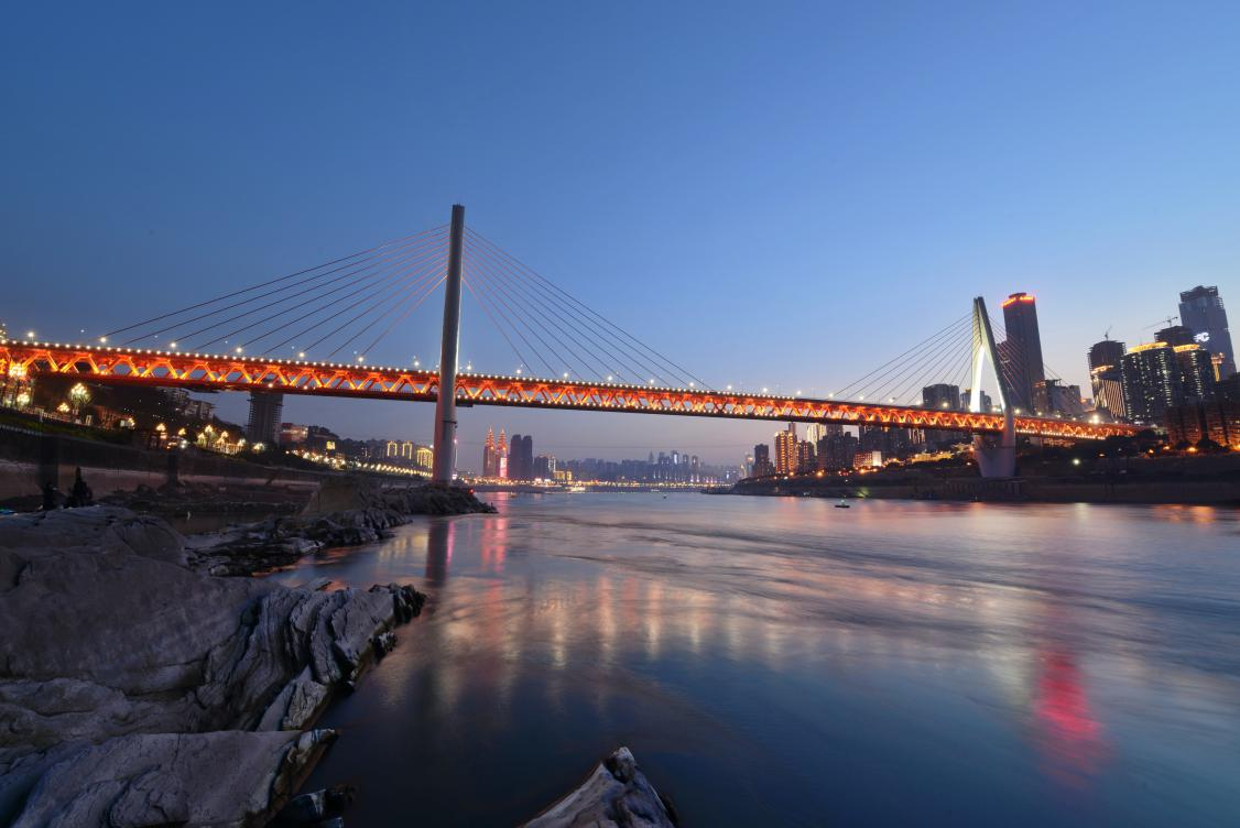 重慶兩江橋包含千廝門嘉陵江大橋、東水門長江大橋兩座大橋。項目位置位于重慶中心,路線穿越了兩江四岸以及CBD渝中半島。東水門長江大橋主橋全長858m,為主跨445m雙塔單索面公軌兩用部分斜拉橋,跨徑布置為222.5m+445m+190.5m;千廝門嘉陵江大橋主橋全長720m,為獨塔單索面公軌兩用部分斜拉橋,跨徑布置為88m+312m+240m+80m。雙層橋面布置,上層為雙向四車道和兩側(cè)人行道,下層為雙線軌道。